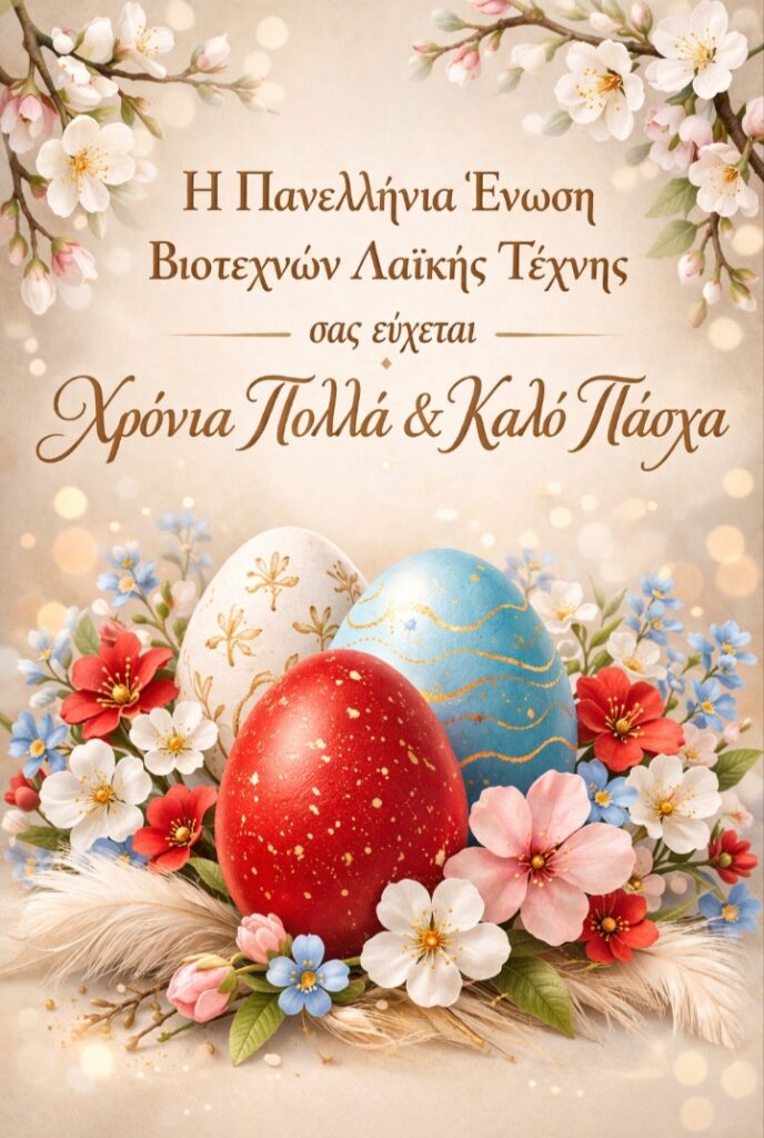 Ο Πρόεδρος και τα μέλη του Δ.Σ. της Πανελλήνιας Ένωσης Βιοτεχνών Λαϊκής Τέχνης σας εύχονται Καλό Πάσχα με υγεία, χαρά και ελπίδα.